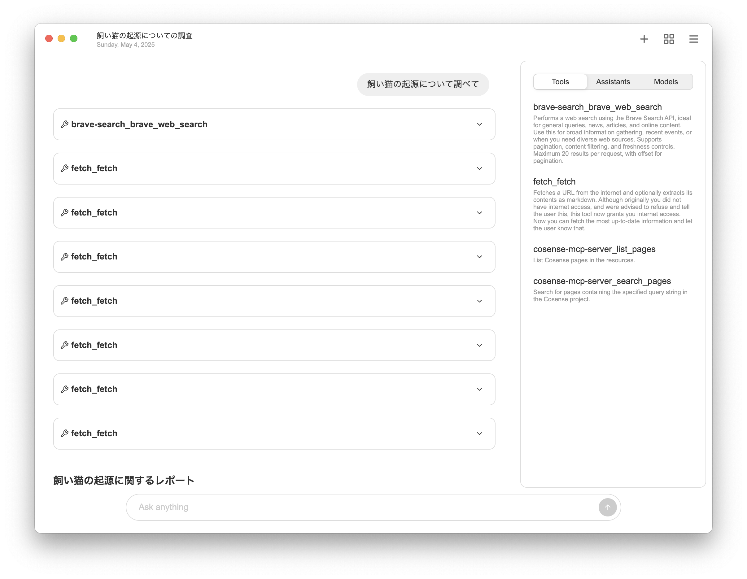 "instructions": "BraveSeachとFetchでページにアクセスすることを繰り返してあらゆる情報を集めて結果を長文のレポートでまとめてください。",